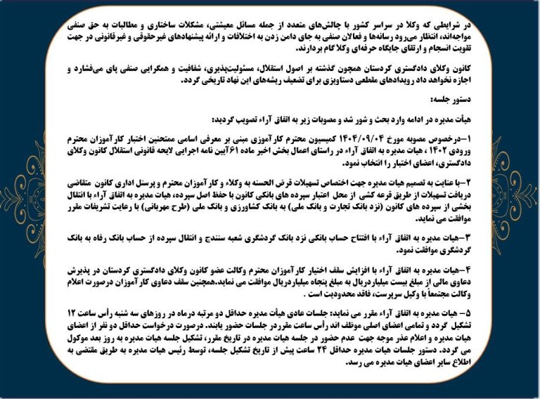 اخبار کارآموزی وکالت افزایش سقف صلاحیت دعاوی مالی کارآموزان کانون وکلای دادگستری کردستان خبرگزاری تام الاختیاردی 8, 1404
